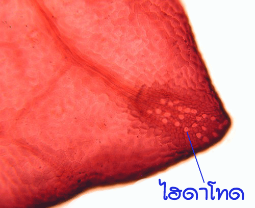 ภาพ ตำแหน่งของรูไฮดาโทดบริเวณปลายใบ และขอบใบ